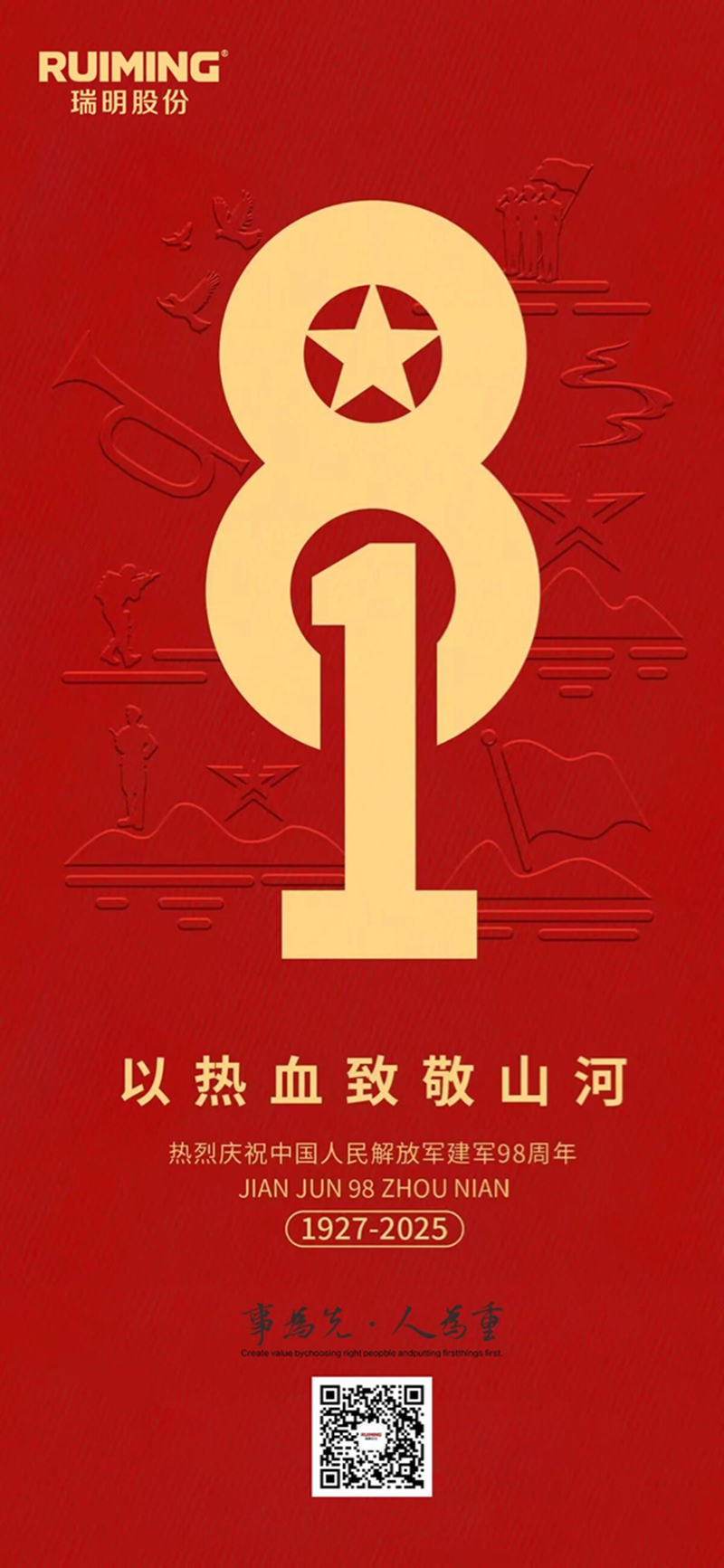 九十八载峥嵘岁月,铁血丹心铸就钢铁长城;九十八年风雨兼程,忠诚奉献守护万家灯火。值此中国人民解放军建军98周年之际,温州瑞明股份有限公司谨向全体人民解放军指战员、武警部队官兵、预备役军人和广大民兵致以最崇高的敬意!